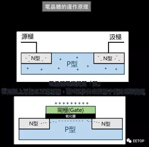 由于P型和N型分别多了电子和少了电子,所以电晶体在 N 型和 P 型接起来的状态下电子不会流通,此时电流开关为「关」。