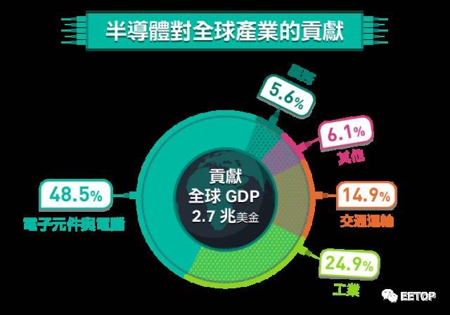 在全球经济体中,半导体相关产业每年带来的经济效益约是 7 兆美元;而在2012年,台湾半导体总产值突破 2 兆台币,跃居世界第 2 位、成为最大的产业群,就业人次高达18万。