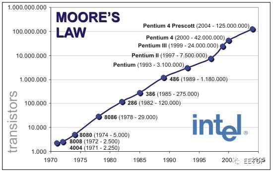从1960年代不到10个,1980年代增加到10万个、1990年代增加到1000万个。这个现象由英特尔的名誉董事长摩尔所提出,称为摩尔定律 (Moore’s Law)。如今,集成电路上的元件高达数亿至数十亿个。